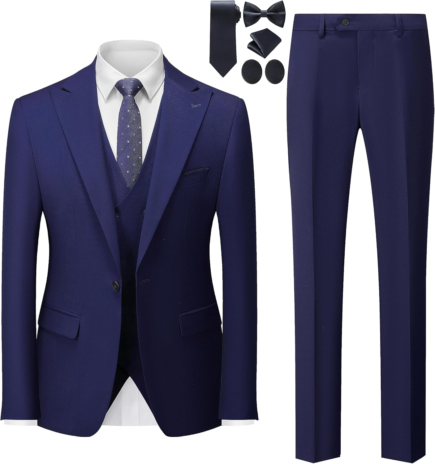 - Package include 1*blazer + 1*trousers + 1*vest + 1*tie set, The slim-fit suit jacket has 2 side pocket and 2 functional breast pockets, 1 exterior, and 1 interior. With a fashion peak lapel, single-breasted buttoning, 1 button closure and a center vent. the expandable waist pants make it felt comfortable,double breasted waistcoat.