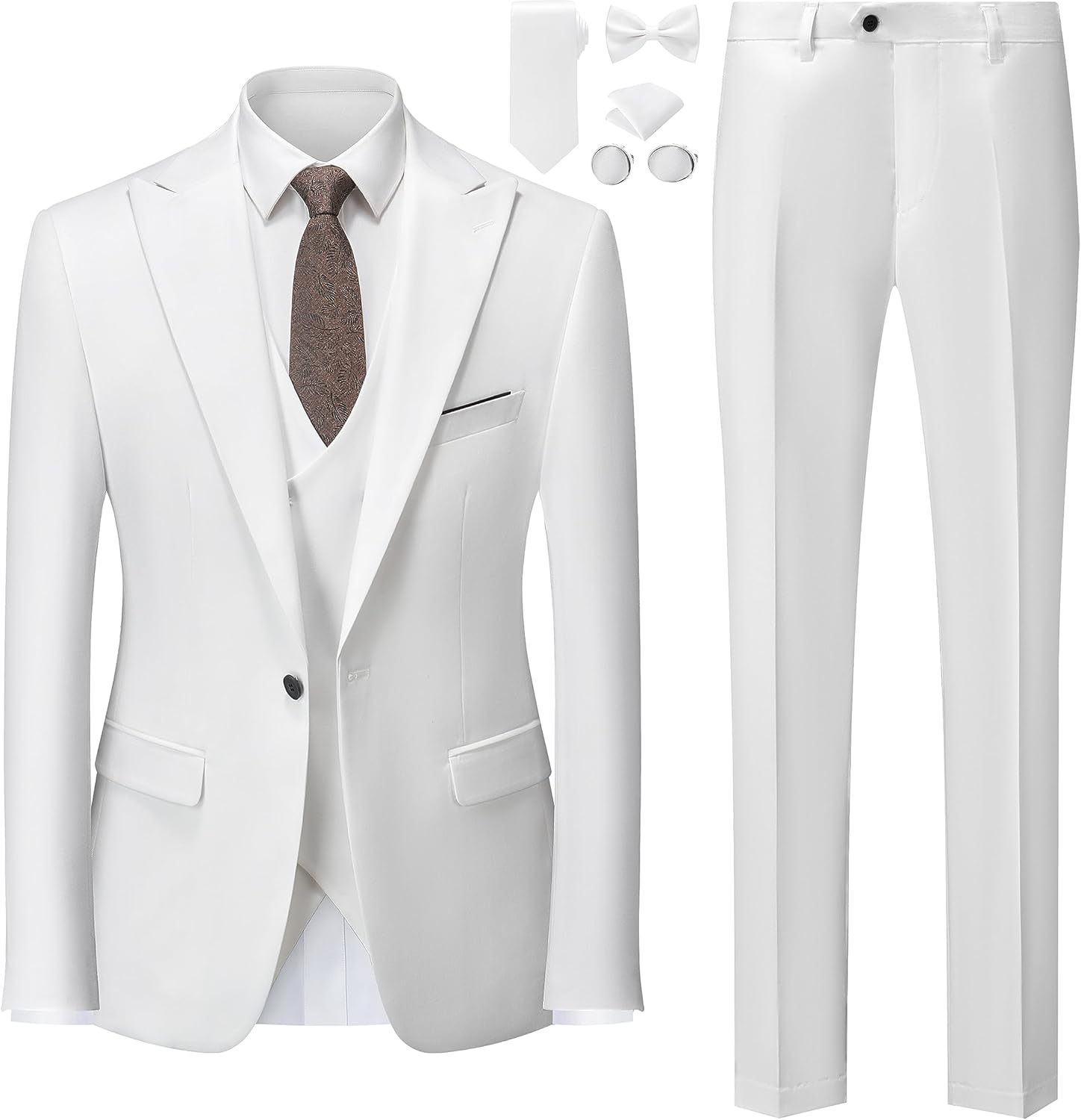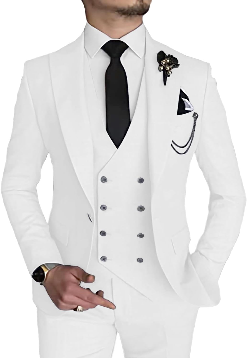 - Package include 1*blazer + 1*trousers + 1*vest + 1*tie set, The slim-fit suit jacket has 2 side pocket and 2 functional breast pockets, 1 exterior, and 1 interior. With a fashion peak lapel, single-breasted buttoning, 1 button closure and a center vent. the expandable waist pants make it felt comfortable,double breasted waistcoat.